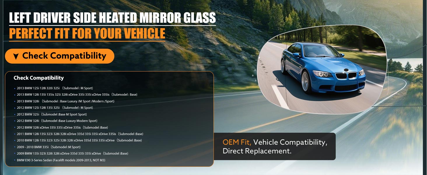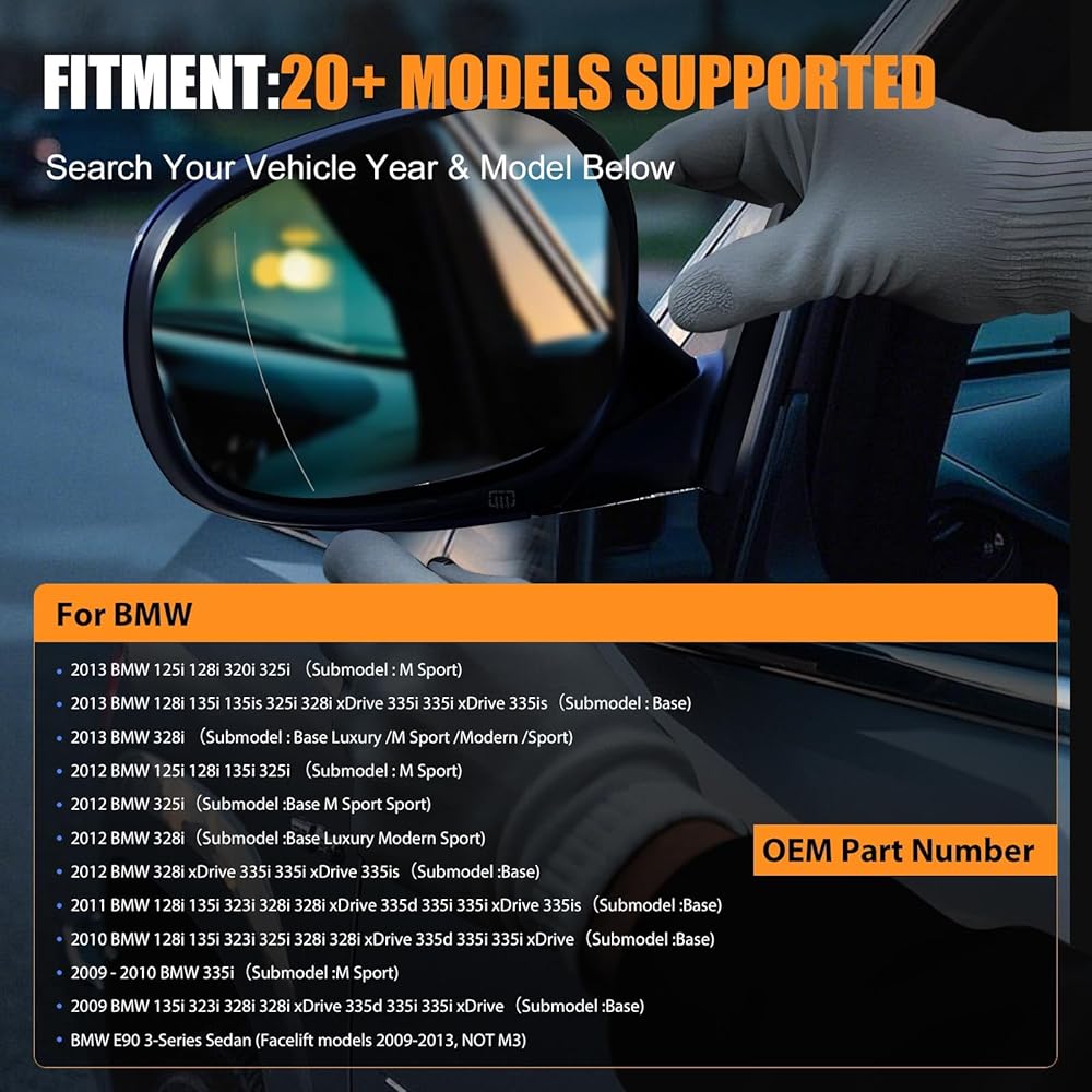 【Vehicle Specific Design & Perfect Fitment】 Driver Side Mirror Glass,compatible with BMW E90 125i 128i 135i 135is 320i 323i 325i 328i 335d 335i 2009-2013,Direct OEM replacement ensures seamless integration with factory mounts—no drilling or modifications needed. Restores clarity and safety with a precise, fit to eliminate loose mounting or gaps