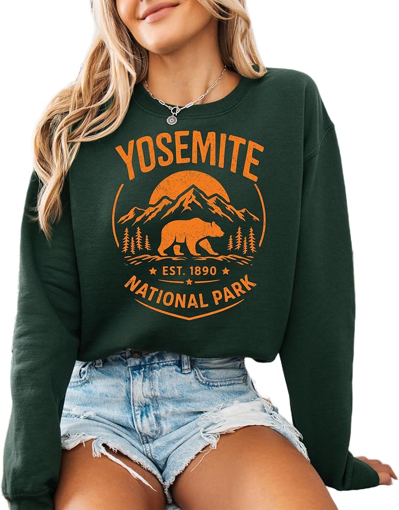 Show your love for the great outdoors with this Yosemite National Park sweatshirt featuring a bold mountain and bear graphic. Designed with a vintage-inspired layout and “Est. 1890” detail, this pullover captures classic national park adventure vibes.Comfortable and easy to style, this crewneck pairs effortlessly with jeans, leggings, or shorts for a laid-back outdoor look. Whether you're exploring trails or relaxing at home, it's the perfect way to represent your favorite park destination.