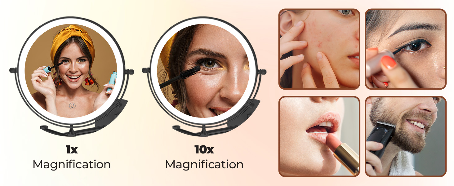 1X/10X MAGNIFYING BATHROOM WALL MIRROR - 8-inch double-sided mirror switches between regular 1X view and powerful 10X magnification. This bathroom mirror with lights is ideal for detailed tasks like tweezing and applying eyeliner.