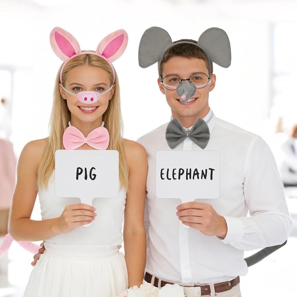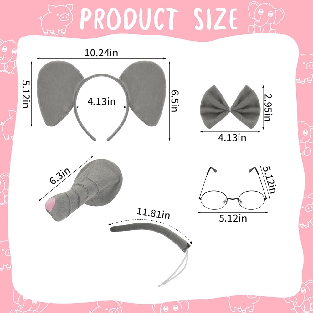 【Pig and Elephant Costume Set】Our costume set includes pig ears, pig nose, pig bow tie, pig tail, as well as elephant ears, elephant nose, elephant bow tie, elephant tail, vintage glasses and a hand-held sign. The complete set of elephant and pig costumes is sufficient for two people to perfectly recreate the classic image of Reading Day!
