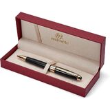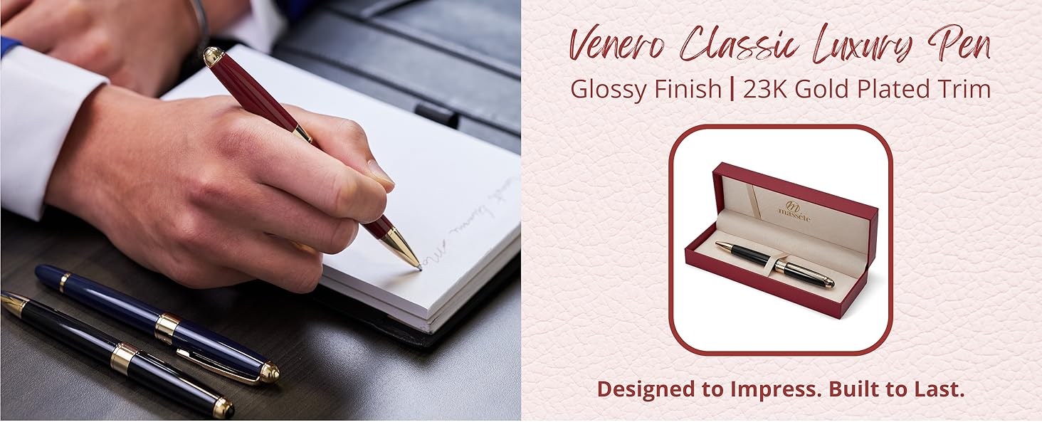 Massete Venero Executive Classic Luxury Ballpoint Pen, Glossy Black with 23K Gold Plated Trim, Twist to Open, Presented in Gift Box, Extra Refill Included, Medium Tip, Black Ink - Custom Engraved