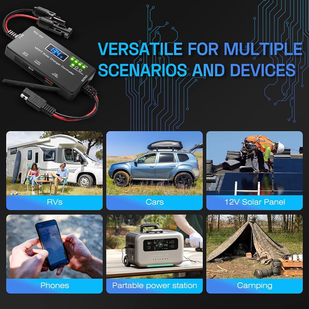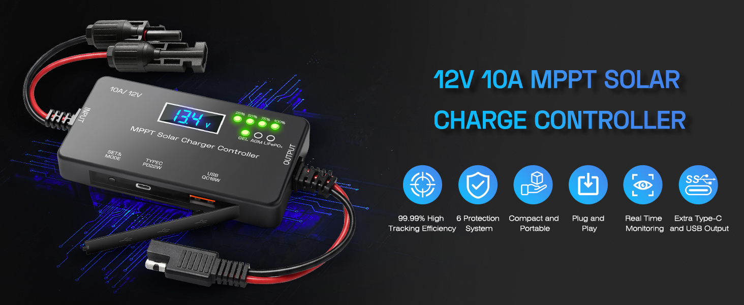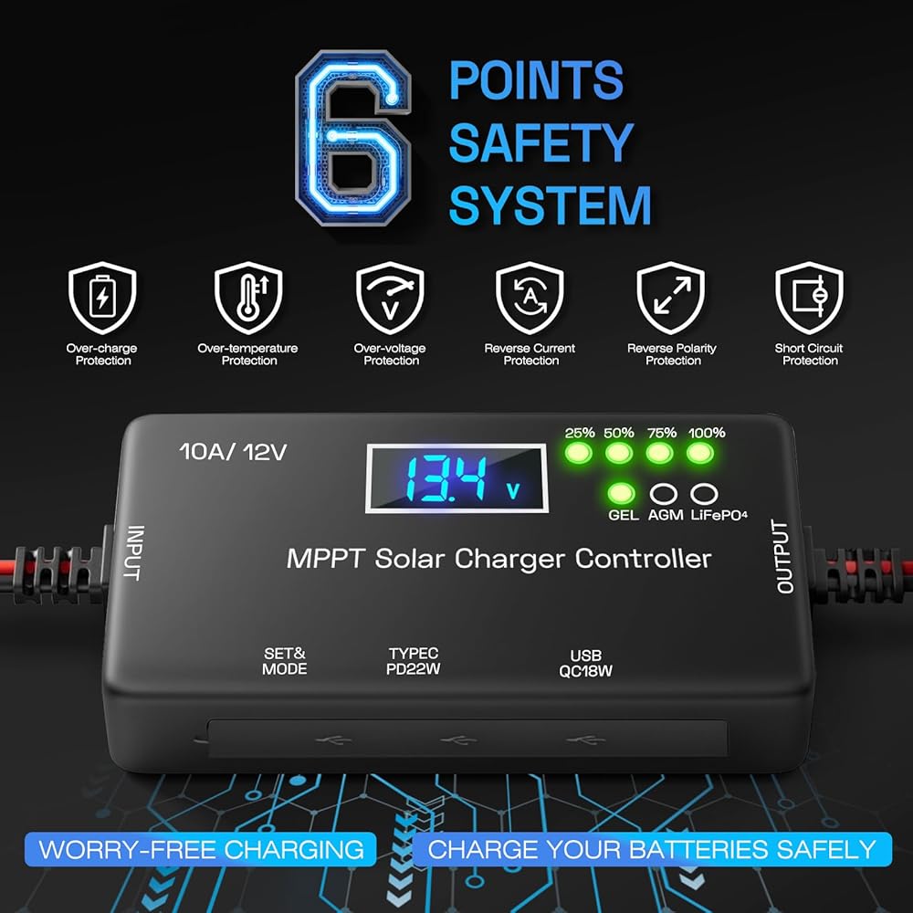 MPPT Solar Charge Controller 12V 10A, Solar Panel Regulator with LCD Display, Type-C & USB Charging Ports, Compatible with LiFePO₄, Lithium, Gel, AGM Battery for RV Boat Marine Off-Grid System