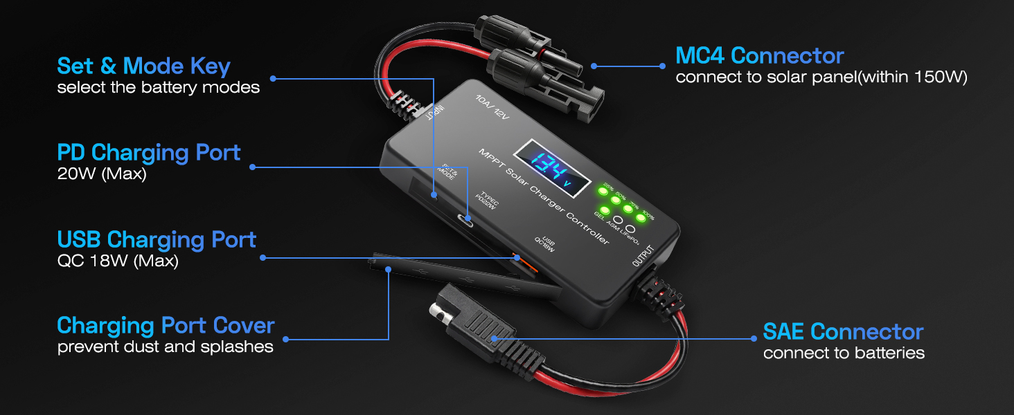 Ultra-Low Standby: Protect Battery Longevity.Engineered with Zero Nighttime Consumption technology. It draws 0A from your battery when there's no sunlight, effectively preventing power loss and extending your battery life. uilt-in industrial-grade safeguards protect against overcharge, reverse polarity, and short circuits for worry-free 24/7 operation