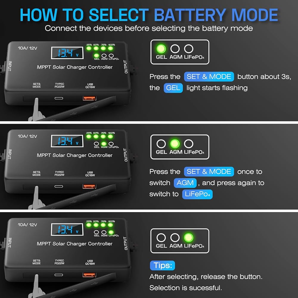 Multi-Battery Compatibility: A versatile powerhouse for most 12V systems. Whether it's an RV LiFePO₄ bank, Boat AGM, or Gel battery, our controller offers a dedicated charging profile for each