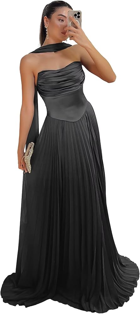 Features:This dress features a sleek satin bodice with pleated detailing at the chest, flowing into a flowy chiffon skirt adorned with pleats. The strapless design, complemented by a long chiffon scarf that adds movement and grace, elevates the silhouette into a harmonious blend of sophistication and refinement.