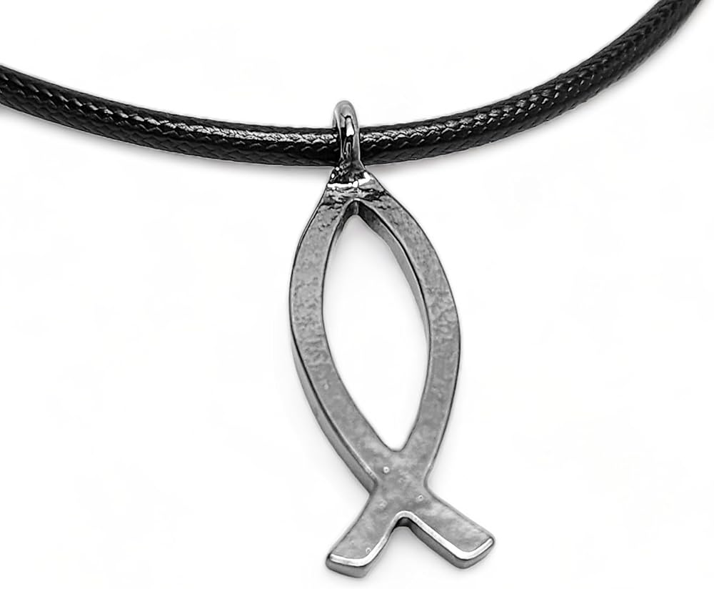 Ichthus Fish Dark Metal Necklace is a lead free pewter pendant that has a special antique Dark Metal finish that is awesome. It features a very cool fish pendant that comes on a soft black cord that measures 22 inches with lobster claw closure. What is a Gun Metal? It is a special finish that is darker than silver finishes but not full black. It is a smooth dark gray finish that is very close to the same color as the barrel of a fire arm.