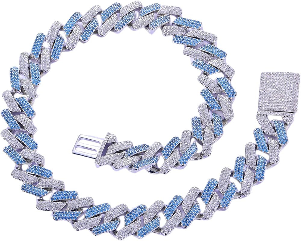 ICEDIAMOND 20mm Dual Colors Zirconia Iced Out Miami Cuban Chain Necklace, Prong Setting Blue-Clear Diamonds