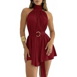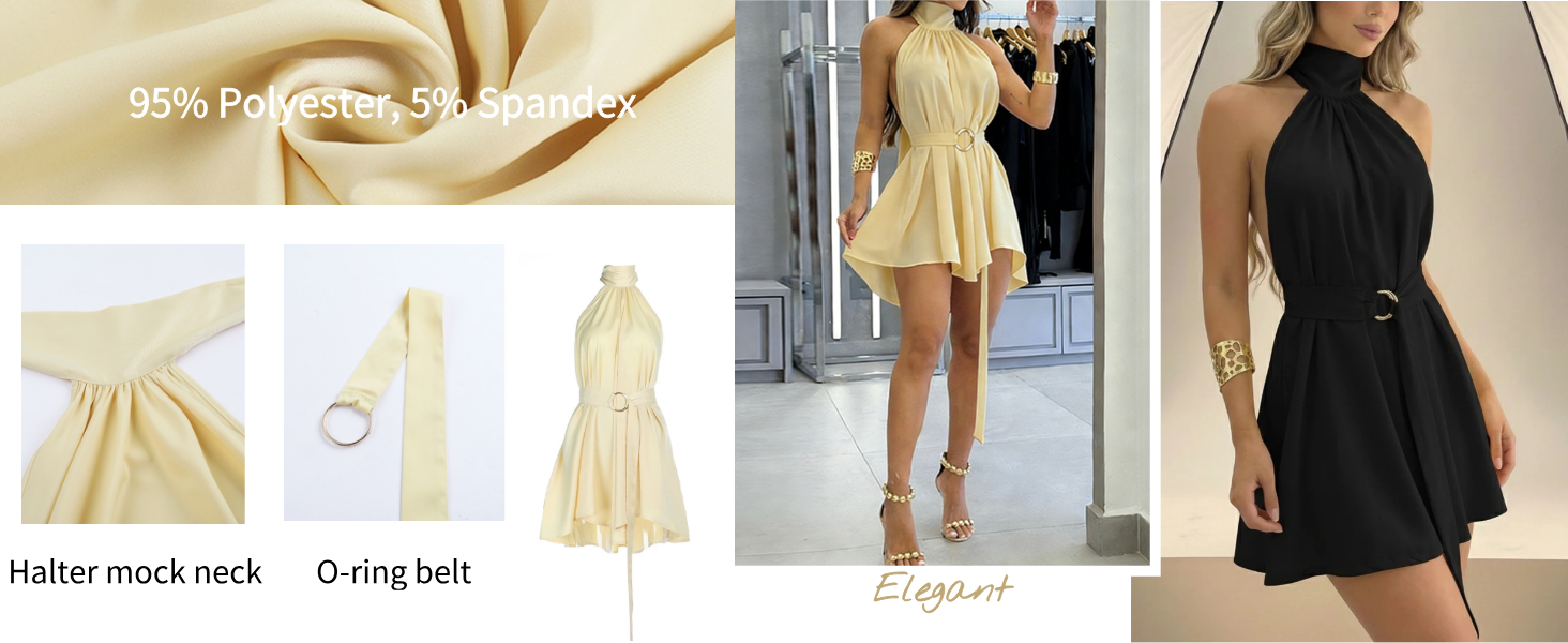 Feature:Women halter mock neck tie waist backless dresses.Designed with halter neckline,and a detachable O-ring belt to cinch the waist for a flattering silhouette. Belted tie waist backless a-line mini dress,halter neck tie open back short dresses,mock neck sleeveless party club night out dress with belt.