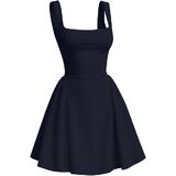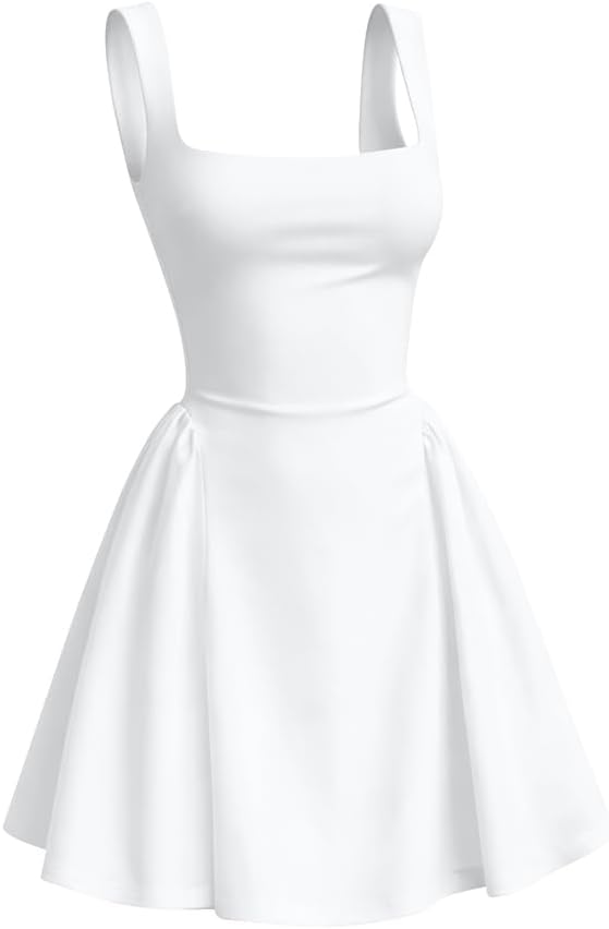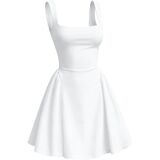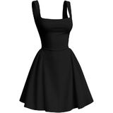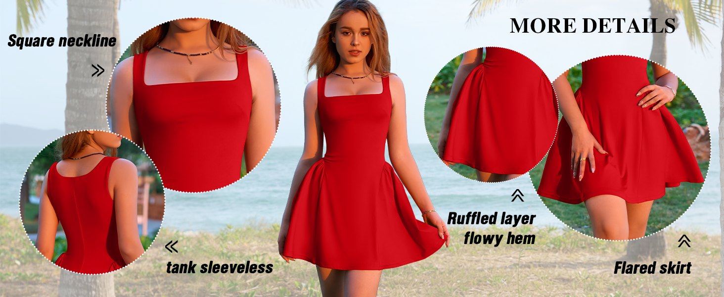 Features: square neck dress, tank sleeveless, flare mini dress , ruffled layer flowy hem dresses, high waist, solid color, above knee length short dress, pair it with your favorite high heels and eye-catching jewelry for a charming look.