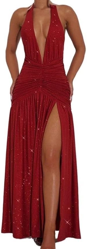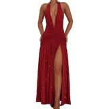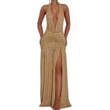 2025 Spring New Sexy Hanging Neck Bright Silk Long Dress V-neck Split Fit Dress