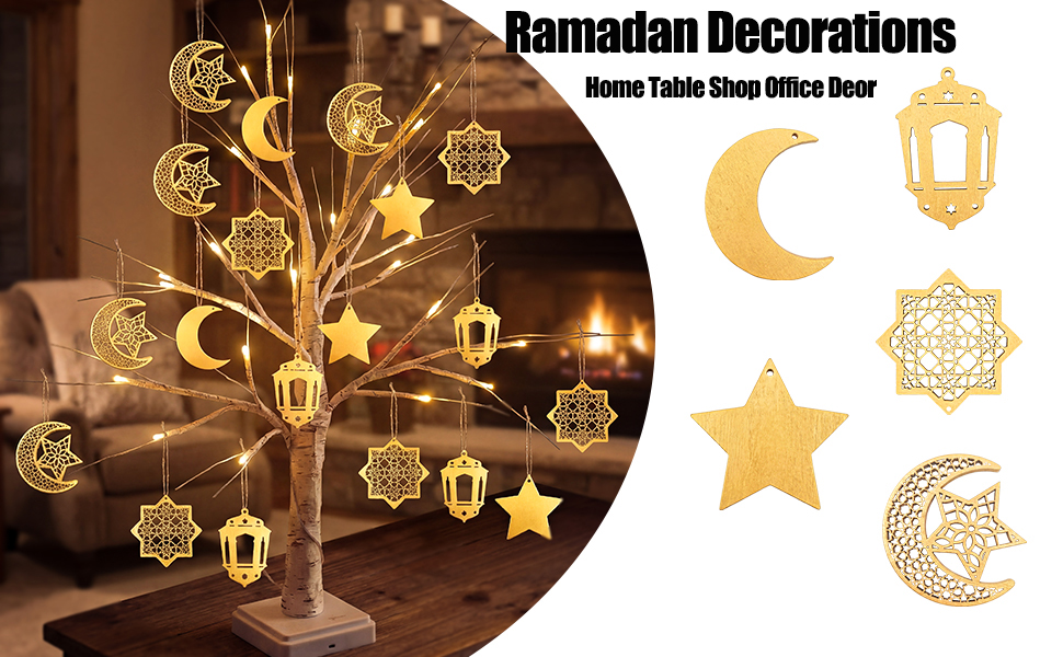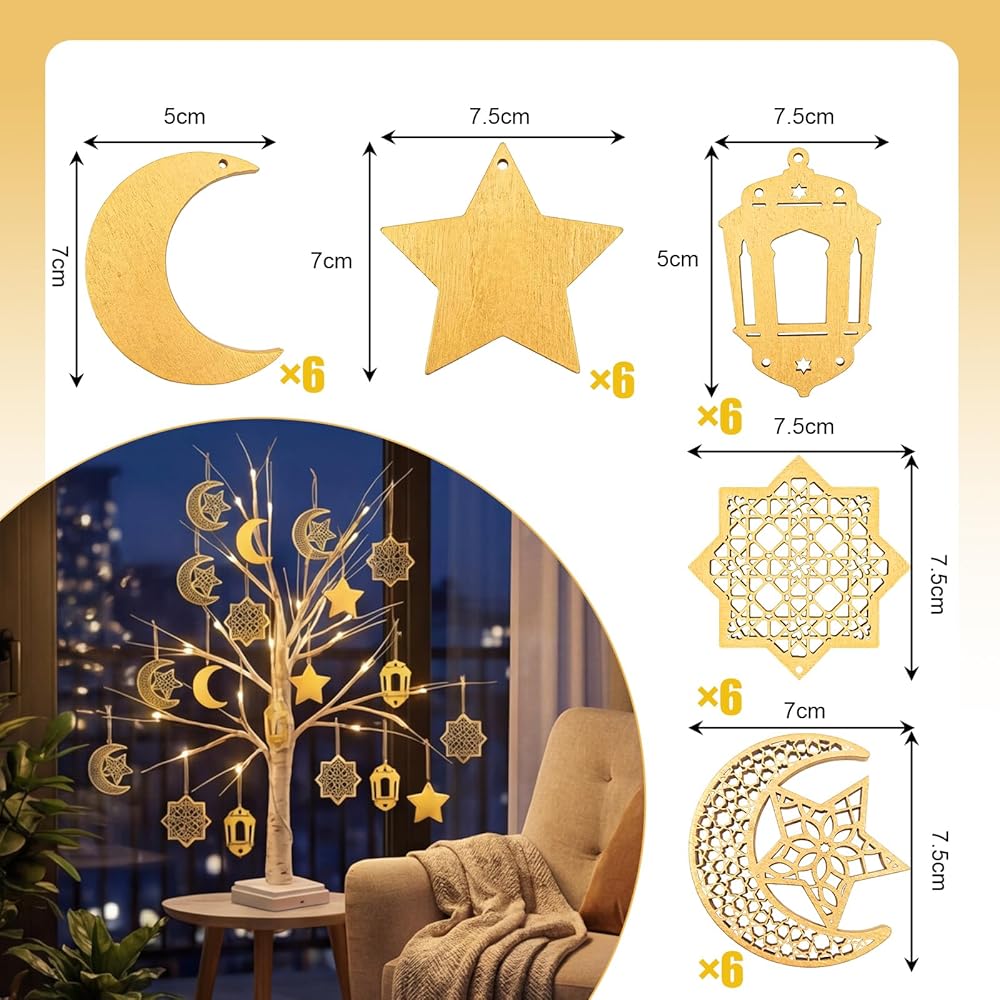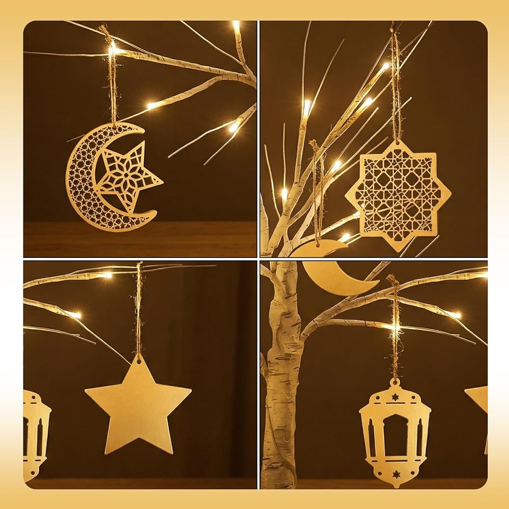 All-in-One Ramadan Decorations Set: Get a 60cm LED-lighted birch tree with lights + 30 gold Islamic decor ornaments (moons*5, stars*5, lanterns*5, geometric patterns*5,moon&star*5) — everything you need for instant Eid Mubarak decorations ambiance. Perfect for ramadan decorations for home and Eid decor!