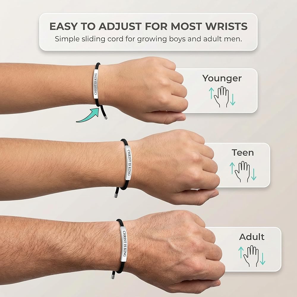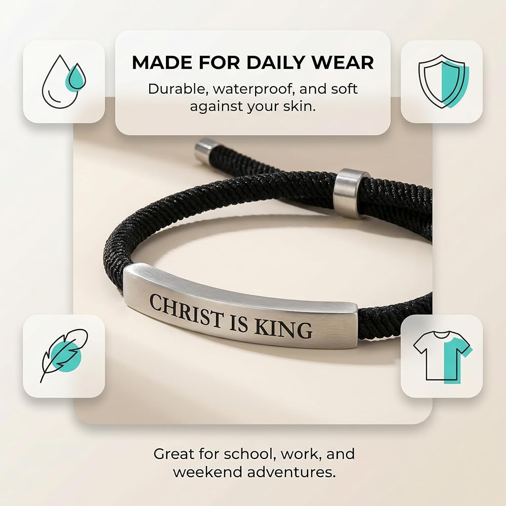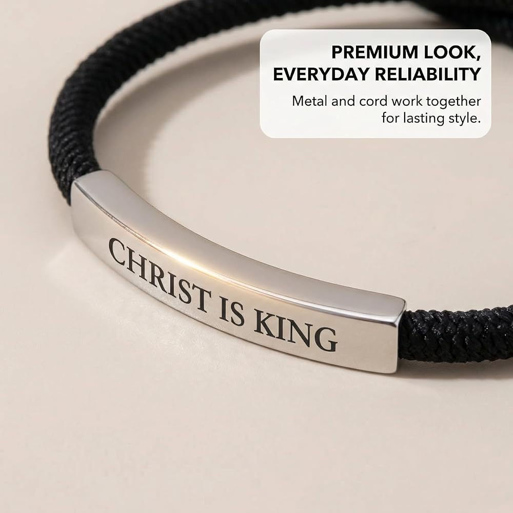 Introducing our Jesus Bracelets for Men, an exceptional piece of Christian jewelry designed to symbolize faith and devotion. This unisex wristband bracelet embodies a sleek and discreet appearance, making it an ideal accessory for casual settings. It features a braided cotton cord that is not only stylish but also ensures comfort throughout the day. The adjustable length guarantees a perfect fit for every wrist, while its waterproof design offers durability, making it suitable for everyday wear. The bracelet is elegantly engraved with 'Christ is King', serving as a constant reminder of faith and spiritual guidance. This piece is more than just a fashion accessory; it is a testament to one's beliefs and an encouragement to share the prayer and strength that comes from within. This attractive bracelet is perfect as a Christian men's gift, suitable for occasions such as baptisms or as a thoughtful gesture for anyone embarking on their spiritual journey. As a piece of Christian stuff, it is not only a stylish addition to any outfit but also a meaningful gift. Whether you're searching for Christian gifts for men or looking to add to your collection of Christian jewelry, this Jesus bracelet stands out with its great build quality and beautiful design. The bracelet's discreet style makes it an excellent choice as a men's cross bracelet, seamlessly blending with any attire. It serves as a spiritual bracelet for men, a perfect representation of faith and devotion. For those seeking mens Christian gifts, this bracelet is a timeless piece that speaks volumes of one's spiritual journey. Its versatility and symbolism make it a must-have for anyone interested in Christian accessories for men. Embrace your faith with our Jesus bracelets for men, a cherished piece of Christian jewelry that resonates with the core of spiritual belief. This men's Christian bracelet is more than just an accessory; it is a declaration of faith and a reminder of the strength found in belief.