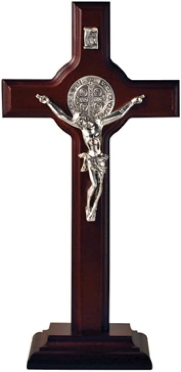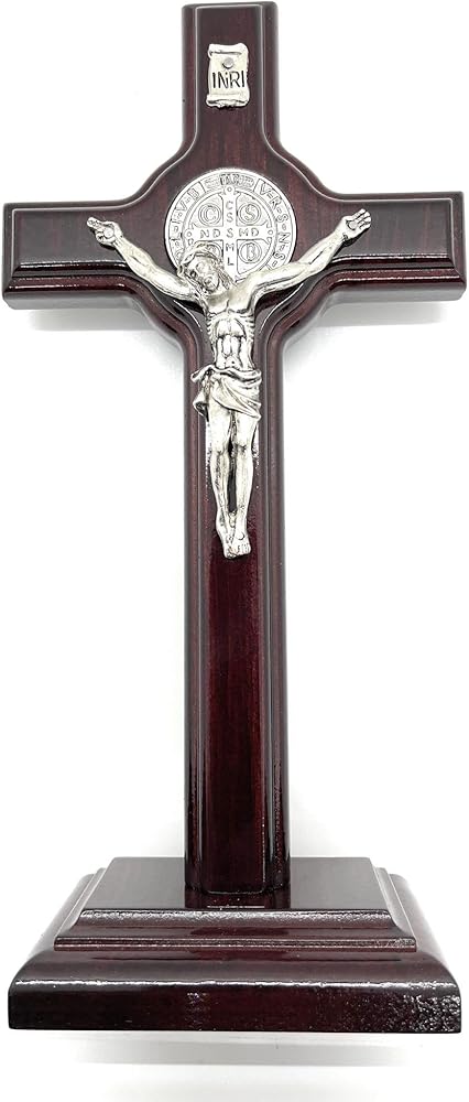 San Francis Imports St Benedict Crucifix Wooden Table Cross With Base - Handmade Saint Benedict Cross Decor - Catholic Crucifix - 9.5 Inches - Made in Italy-Dark Cherry Wood