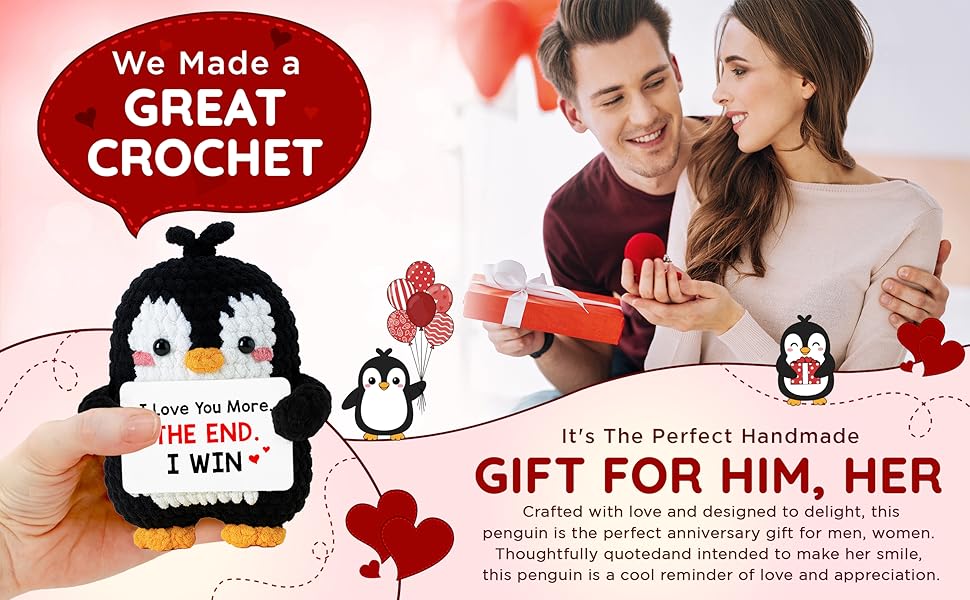 PERFECT FOR ANY OCCASIONS – Whether you're searching for an anniversary gifts for men, anniversary gifts for women, Valentines Day gifts for Him, Valentines Day gifts for Her, or Birthday gifts, this handmade crochet penguin with love makes a meaningful present for him or her. It's a perfect keepsake that captures the special moments and feelings in your relationship.