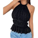 Feature:Women sexy ruffle hem backless halter camisole,Y2k sleeveless lace-up back ruched beach tank shirts,vintage chiffon open back tie back peplum tank top,casual solid pleated cami blouse,trendy off shoulder ruffle front tee shirt summer going out party club streetwear,dressy slim fit tie back plain babydoll cami tops,fiting nicely making it a super stylish and simple versatile halter top for Summer
