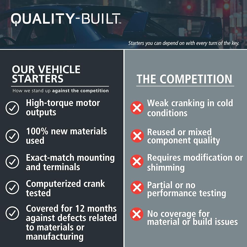 Whether you're firing up a daily driver or restoring an older vehicle, QUALITY-BUILT new and remanufactured starters are engineered to deliver confident, consistent cranking power. Every unit undergoes real-world durability testing to ensure performance that meets or exceeds OE specifications-no matter the conditions. Each starter features 100% new, premium sealed bearings for long-lasting durability, plus lead-free brushes that improve conductivity and reduce resistance. Precision-machined commutators and thoroughly tested armatures optimize voltage transfer and output. The starter drive clutch is remanufactured using aerospace-grade lubricants for smooth, efficient energy delivery to the flywheel. From the solenoid to the starter drive gear, every component is inspected and upgraded where necessary to guarantee reliable performance. Built to handle the demands of modern engines, QUALITY-BUILT Starters are a smart, OE-quality replacement that delivers lasting value and peace of mind with every start.