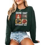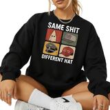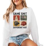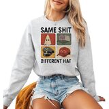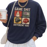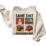 Bold statement sweatshirt featuring the phrase “Same Sh*t Different Hat” in a retro protest style.