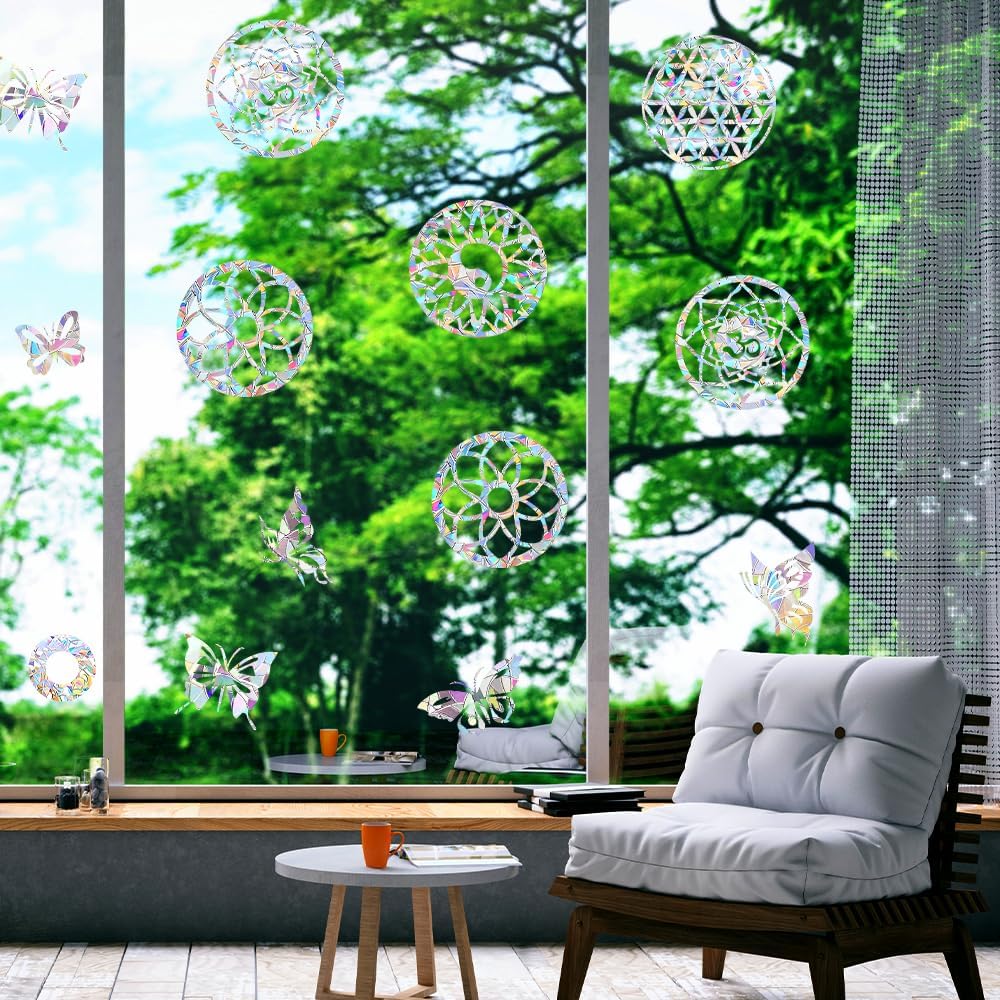 Non adhesive vinyl window clings with prismatic effect can warn birds, protect them from hitting the window.