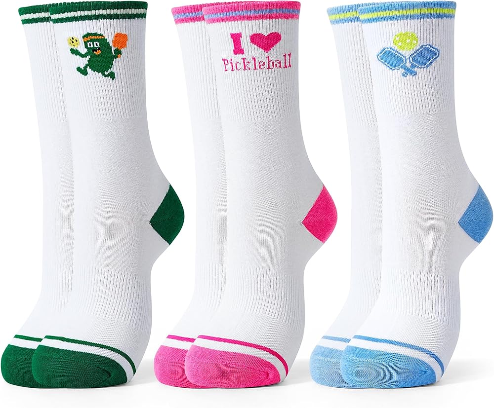 Jeasona Pickleball Socks for Women Pickleball Gifts for Women Pickle Ball Lovers- 3 Pairs Funny Sports Cotton Crew Socks with Arch Support, Athletic Socks US Size 6-9