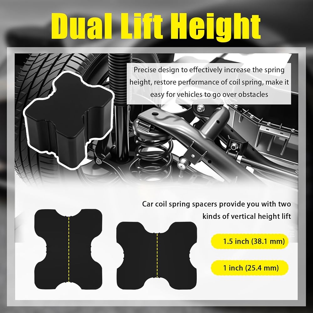 1. Two vertical lift heights of 1 inch and 1.5 inch, use these coil spring spacers to raise the spring height and restore coil performance, a must for car repair and maintenance