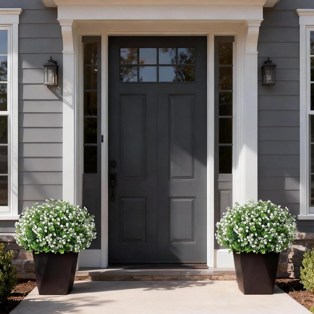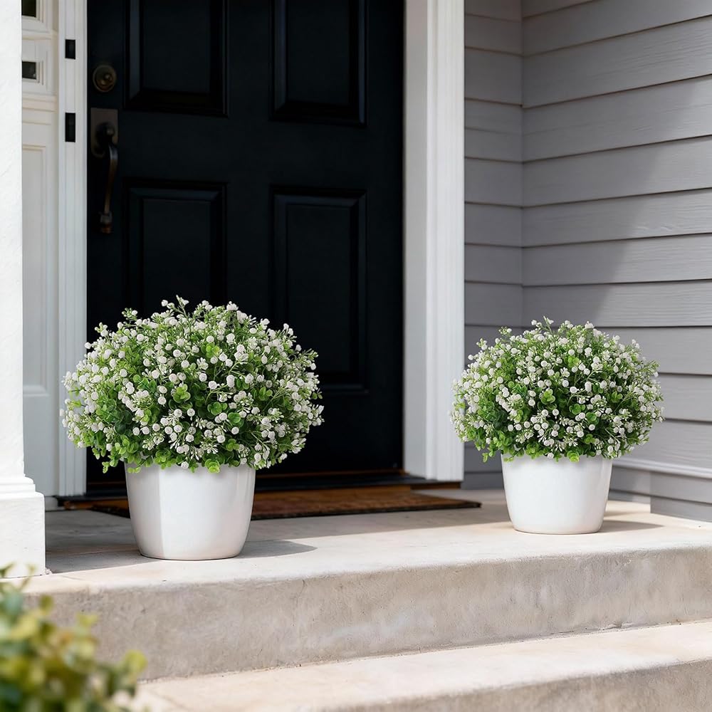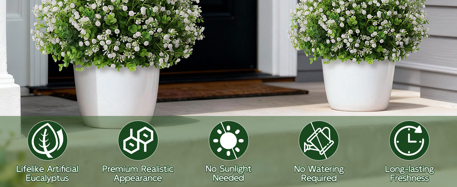Artificial Eucalyptus with Baby's Breath Topiary Ball Trees - 2 Set Plastic Faux Eucalyptus Plants in Pot, Sun Resistant Fake Greenery Potted Bushes for Front Door Farmhouse Garden Porch Decor