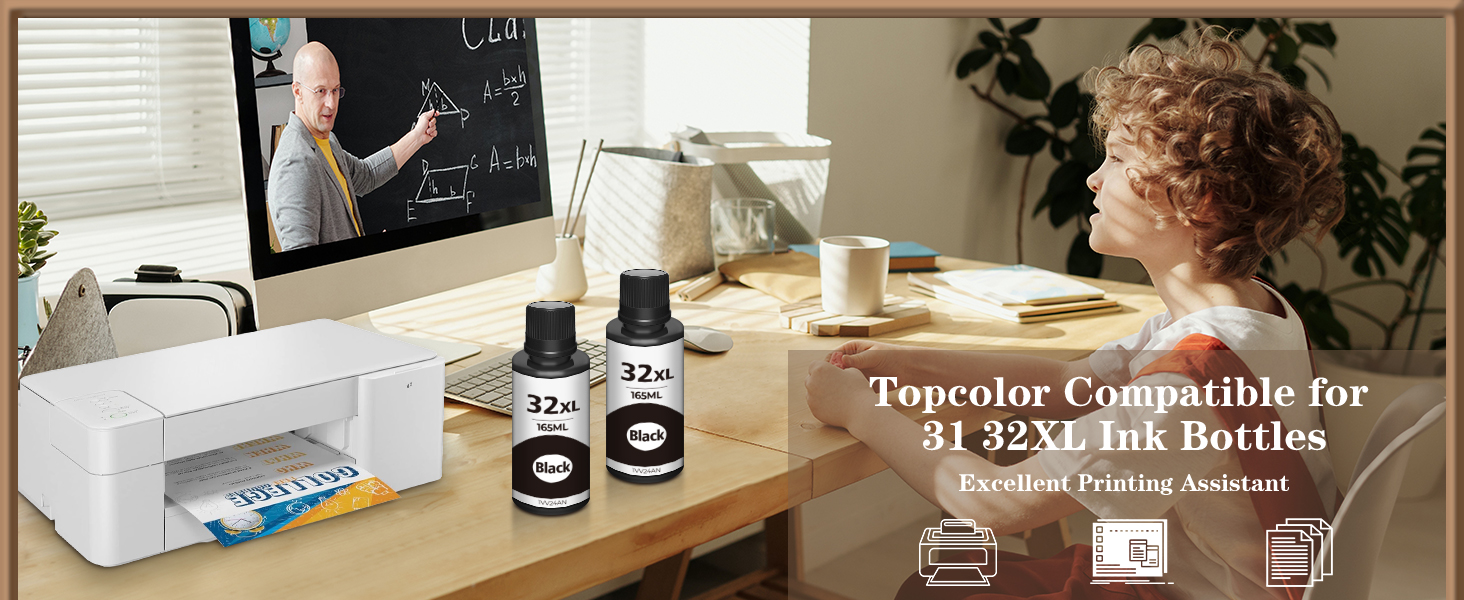 Larger capacity: Compatible for HP 32XL Combo Pack (2 Black).Compatible for HP 31 32XL black ink bottles 165 ml prints More than 9000 pages/per bottle (A4/5% coverage)