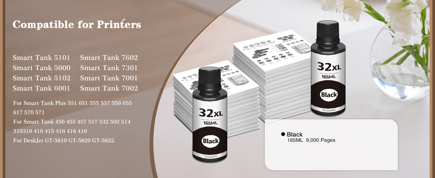 Printer Models Replacement for HP 31 32XL ink bottles: Compatible for HP smart tank 7602, smart tank 7001, smart tank 5101, smart tank 7301, smart tank 5103, smart tank 6001,smart tank Plus 651, Smart Tank Plus 555 557 559 655 617 570 571, Smart Tank 450 455 457 517 532 502 514, DeskJet GT-5810, DeskJet GT-5820, DeskJet GT-5822; Ink Tank 310 319 410 415 416 418 419