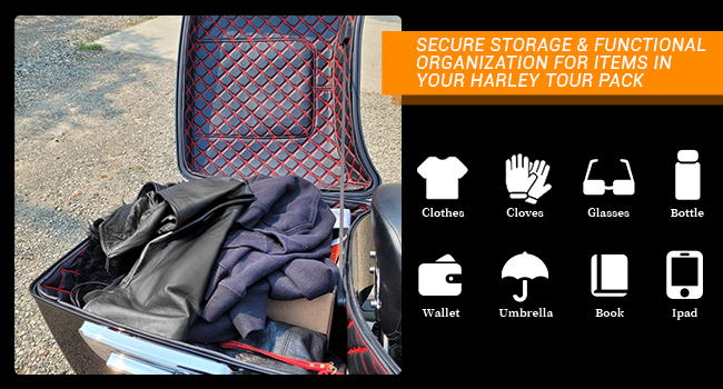 Ride Happier, Stay Organized - Our tour pack liner for Harley organizes your load and reduces distractions. Reach what you need quickly and ride with peace of mind. If you have any issues with fit or performance, reach out to us and we'll make it right.
