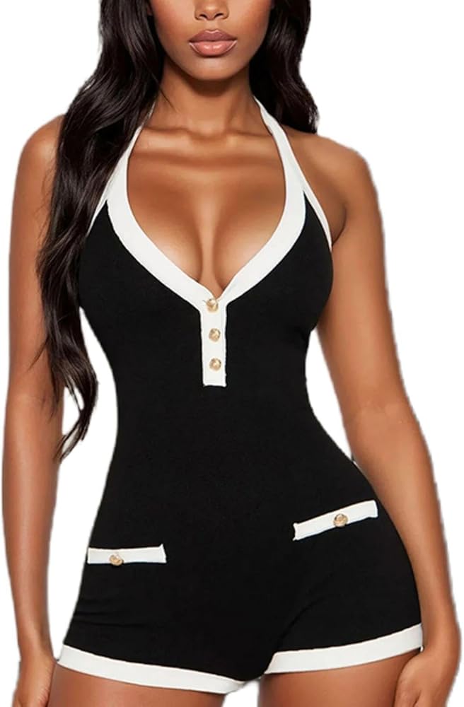 DESIGN:Summer jumpsuithis,is uniquely designed with sleeveless,deep v,hanging neck,backless,button down.The v neck and backless adds a sexy element,suitable for women who pursue fashion and personality.