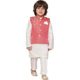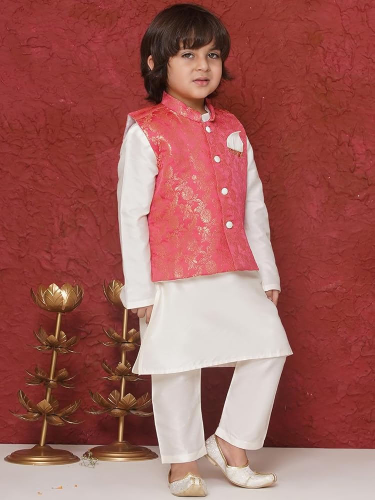 AJ DEZINES Brocade Full Sleeves Jal Embroidery KPW Set for Boys Enhance your young boy's ethnic wardrobe with this stunning KPW set from AJ DEZINES. Perfect for special occasions, this set combines traditional elegance with modern sophistication. Key Features: Premium Brocade Fabric: Crafted from high-quality brocade, this set offers a rich, textured feel and a luxurious look, ensuring your boy stands out at any event. Intricate Jal Embroidery: The kurta features exquisite jal embroidery, adding an element of detailed artistry and enhancing the overall aesthetic appeal of the outfit. Complete Outfit: This set includes a full-sleeve green kurta, a comfortable pajama, and a matching waistcoat. The coordinated design ensures a polished and cohesive appearance. Elegant Design: The vibrant green color and sophisticated embroidery make this set a versatile choice for various festive occasions, from weddings to cultural celebrations. Comfort and Fit: Designed to provide a perfect fit for boys, this ensemble allows ease of movement and ensures comfort throughout the day. With AJ DEZINES Brocade Full Sleeves Jal Embroidery KPW Set, your boy will look dapper and stylish, making a memorable impression at any gathering. This ethnic set for boys is available in different colors green, pink and Red.