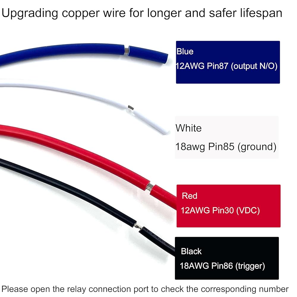 【Harness specification】: Upgraded Heavy 12/18 AWG harness. White-18awg Pin85 (ground), Black-18AWG Pin86 (trigger), Red-12AWG Pin30 (VDC), Blue-12AWG Pin87 (output N/O), (Specific white, black, red, and blue wires correspond to the interface, please open the relay connection port to check the corresponding number.