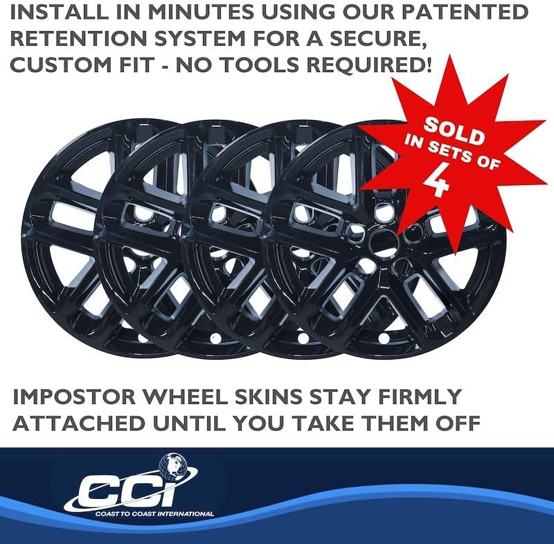 Refresh your wheels with the Coast To Coast IWCIMP482BLK Impostor Wheel Skins. These 18-inch gloss black wheel skins feature an eye-catching 5 Y-spoke design manufactured from robust automotive-grade ABS plastic. Designed to snap-on securely over your OEM alloy wheels, they offer a quick, tool-free installation and reliable retention during all driving conditions. The UV-protected gloss black finish resists cracking and fading, ensuring your wheels maintain a premium appearance over time. This set of four wheel skins is an economical alternative to purchasing new aftermarket wheels, providing a factory-style upgraded look that pairs perfectly with Coast To Coast grille overlays and mirror or door handle covers.