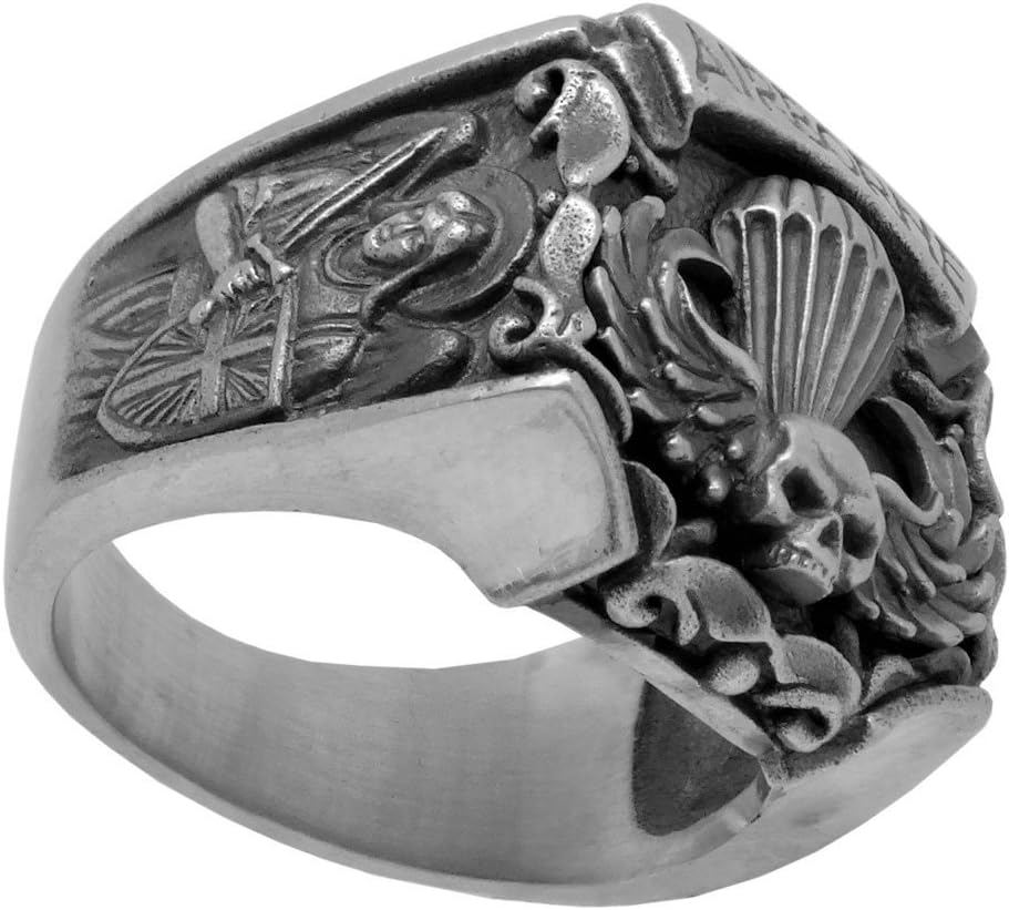 US Army Airborne - “Holy Michael, the Archangel” sterling silver men's ring Original unique design with beautiful details and amazing art work Rare piece, top quality, best craftsmanship, handmade Top dimensions 20x20mm, around 16-18 grams depends on the size Sterling silver Handmade US Army/Airborne “Saint Michael” style men's ring. Top of ring features one very identifiable symbol of the airborne force, parachutist jump wing with the sign “Airborne” on the very top and a skull on the bottom of the face. Airborne forces are military units, usually light infantry, set up to be moved by aircraft and "dropped" into battle, typically by parachute. There is the symbol of “St Michael” on both sides of the ring. In the Roman Catholic teachings Saint Michael has four main roles or offices. His first role is the leader of the Army of God and the leader of heaven's forces in their triumph over the powers of hell. The second and third roles of Michael in Catholic teachings deal with death. In his second role, Michael is the angel of death, carrying the souls of all the deceased to heaven. In his third role, he weighs souls in his perfectly balanced scales. In his fourth role, St Michael, the special patron of the Chosen People in the Old Testament, is also the guardian of the Church. He is also considered patron of grocers, soldiers, doctors, mariners, paratroopers, police, and sickness.