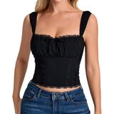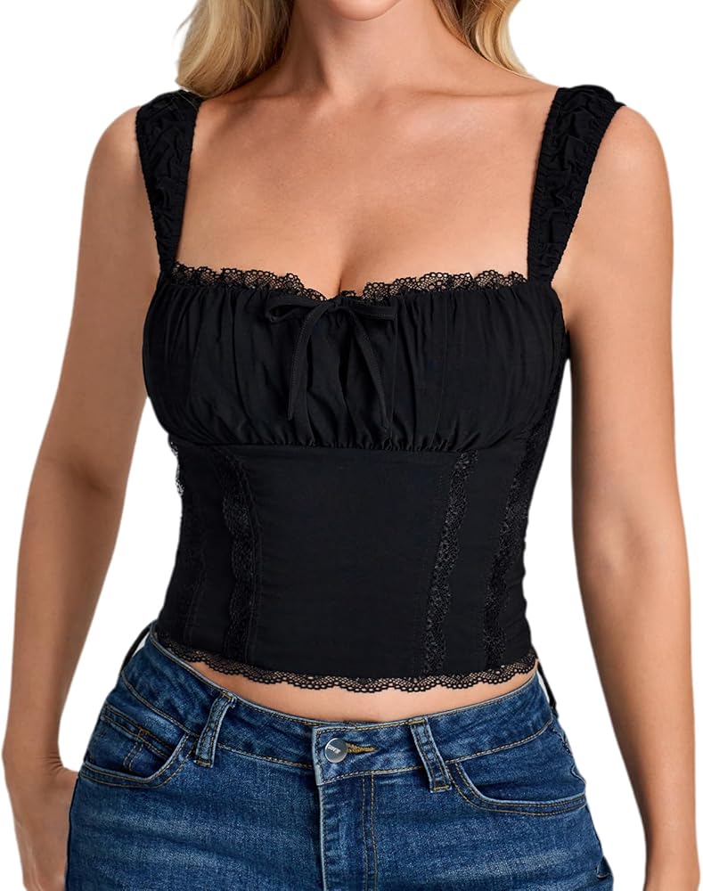 Feature:Designed with delicate lace trim, a charming square neckline, subtle ruching, and a secure back zipper for easy on and off. The corset-inspired seams create a structured, slimming silhouette, while the sleeveless design keeps you cool. A cute lace-up look in front adds Y2K vibes and makes your outfit stand out effortlessly
