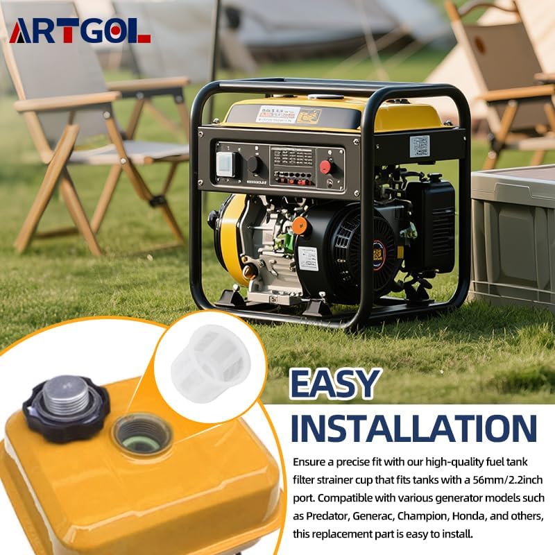 EASY INSTALLATION: Ensure a precise fit with our high-quality fuel tank filter strainer cup that fits tanks with a 56mm/2.2inch port. Compatible with various generator models such as Predator, Generac, Champion, Honda, and others, this replacement part is easy to install