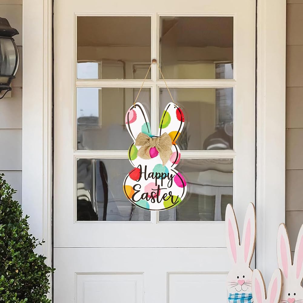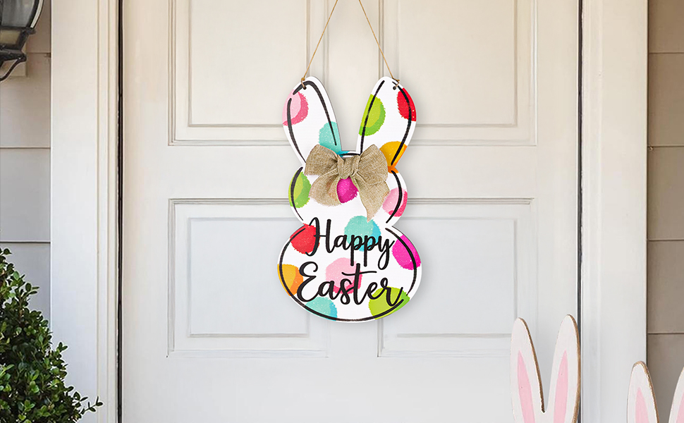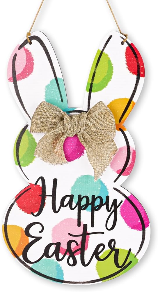 RUSTIC DESIGN: The playful Easter door sign features a charming bunny silhouette decorated with vibrant polka dots in pink, mint, red, orange, and yellow colors. A rustic burlap bow adds a perfect farmhouse touch, while the "Happy Easter" script lettering brings a festive message to your Easter decor.
