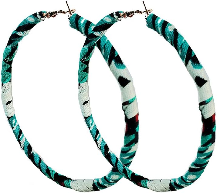 Dupsie's Turquoise Hoop Earrings wrapped in African Print Fabric African Print Large Hoop Earrings Cotton Fabric Wrapped Diameter: 3.6 Inches Fashion Costume Jewelry Color - Includes: Turquoise, red, off-white Makes a great gift