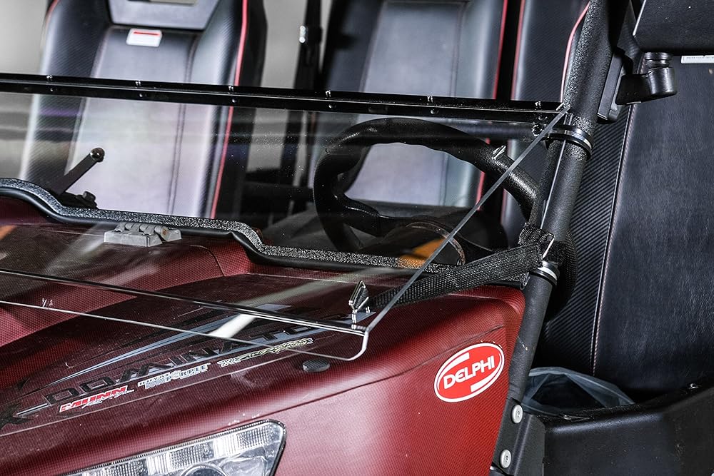 Standard 3/16 inches Polycarbonate - Made from premium 3/16 inches standard polycarbonate, this Odes Dominator X full tilting windshield delivers exceptional impact resistance, clear visibility, and UV protection. This durable polycarbonate material is used in race car and airplane windshields so you can be assured it's strong. UTVs spend a lot of time outside, which is why our windshields are UV-treated to prevent yellowing and damage caused by sun exposure.