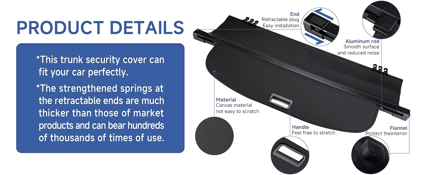 [Superior Material] Trunk lid for 2018 2017 2016 JEEP Cherokee, is made of aluminum alloy and high density waterproof canvas strong, load-bearing capacity, scratch resistant, tear resistant, high temperature resistance, easy to clean.The ends of the cargo cover bars are covered with soft fleece, It can avoid friction noise generated during driving and protect the interior from damage.