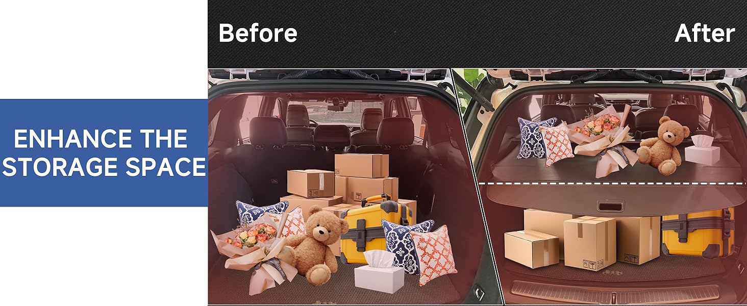 [Space Utilisation] The trunk screen is retractable, included handle, when it is stowed away it takes up almost no space inside the trunk only, when opened, divide the trunk into upper and lower functional areas to provide more storage space and keep the trunk neat and orderly.