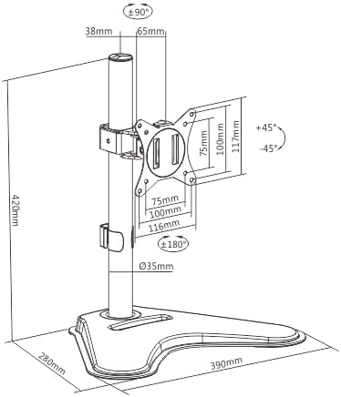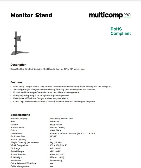 The Multicomp Pro MP010431 provides stable support for a single 17” to 32” monitor up to 9kg(19.8lbs). Flexible design for ample adjustment and viewing angles, adjustable for either portrait or landscape orientation. The freestanding base provides stability and support on any work surface. A detachable VESA plate for user-friendly installation. A convenient phone slot located on the base. Cable clips included for an organized and clutter-free workplace.