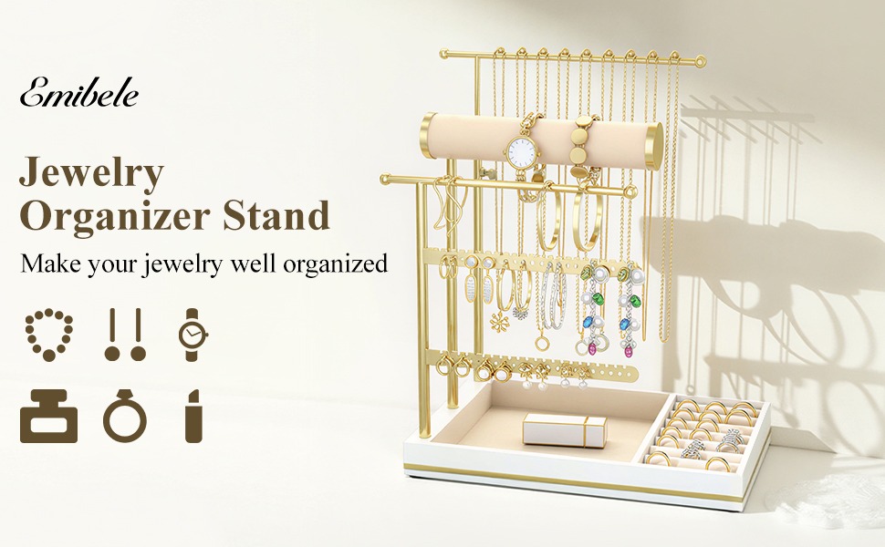 Emibele Necklace Holder Jewelry Organizer Stand, Jewelry Organizers and Storage Holder for Necklace Bracelet Earrings, with Velvet Ring Tray, Elegant Jewelry Stand Tower Gifts for Women, White&Gold