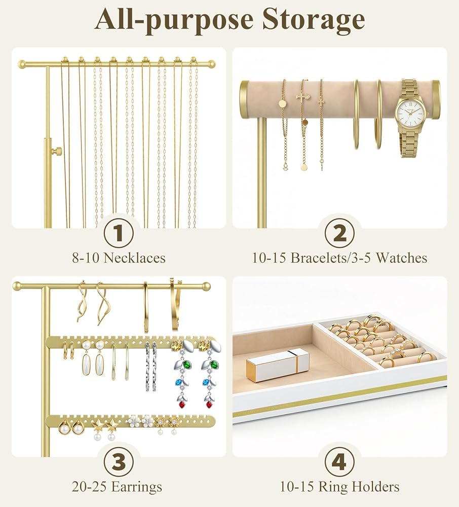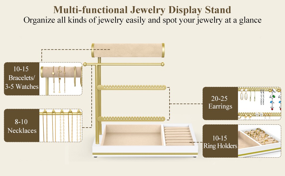Multi-functional Storage: Our all-in-one jewelry holder organizer can hold approximately 8-10 necklaces, 10-15 bracelets, 8-12 bracelets/3-5 watches, 20-25 pairs of earrings, and 10-15 rings. Its layered design keeps all kinds of jewelry in order, meeting your need for centralized storage of necklaces, bracelets, watches, earrings and rings.