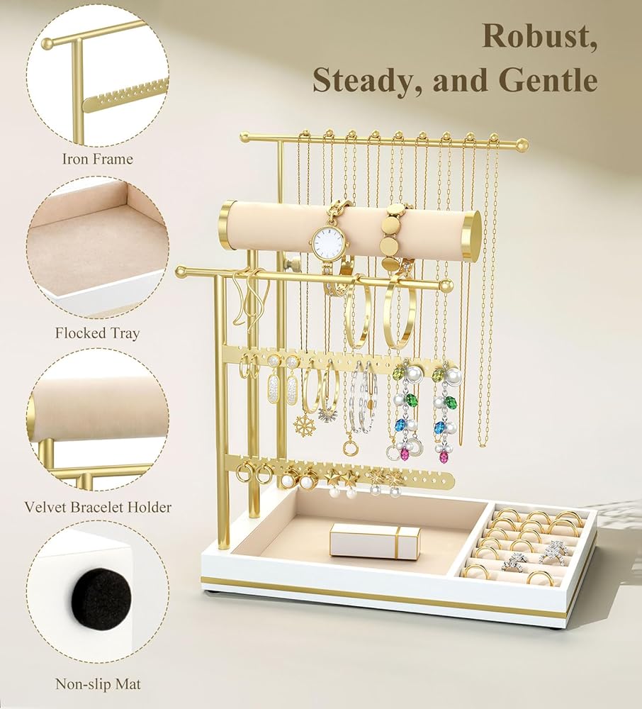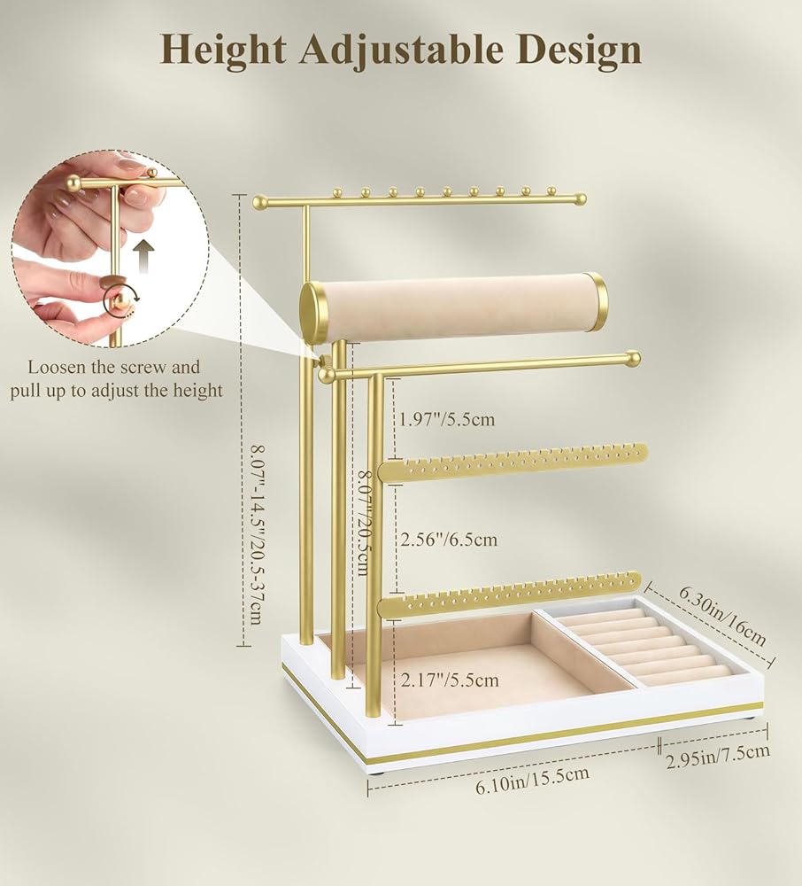 Quality & Style: This jewelry organizer features both sturdy materials and an elegant appearance. It is made of high-quality iron and density fiberboard. The sturdy frame ensures stability and can maintain its shape even with heavy items placed on it. The tray feels comfortable to the touch, is easy to handle, and can protect jewelry from scratches. Its assembled dimensions are 10.4''×6.7''×16.1".