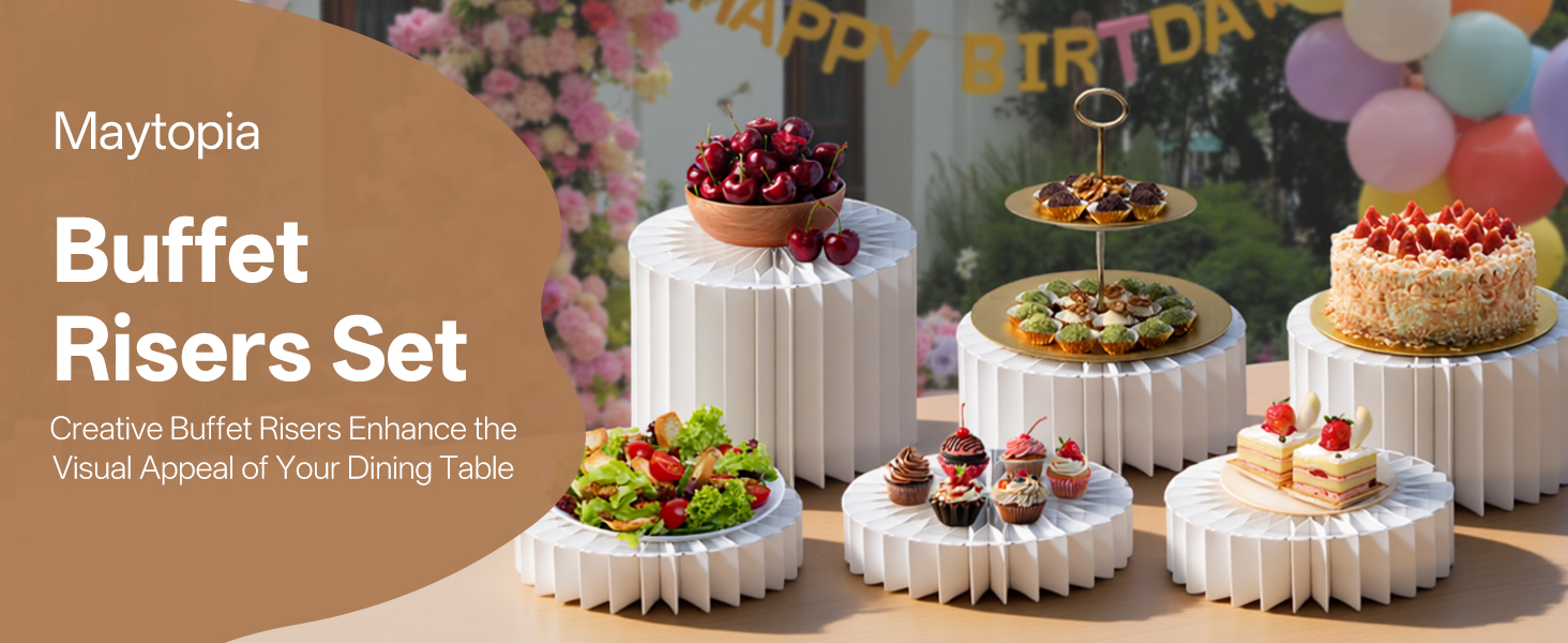 Bonus Labels for a Perfectly Organized Display: Guide your guests with clarity and charm. The food risers set includes six mini L-shaped table signs ,can easily label dietary details, dish names, or thematic messages. These practical accessories make your buffet not only beautiful but also intelligently organized and welcoming