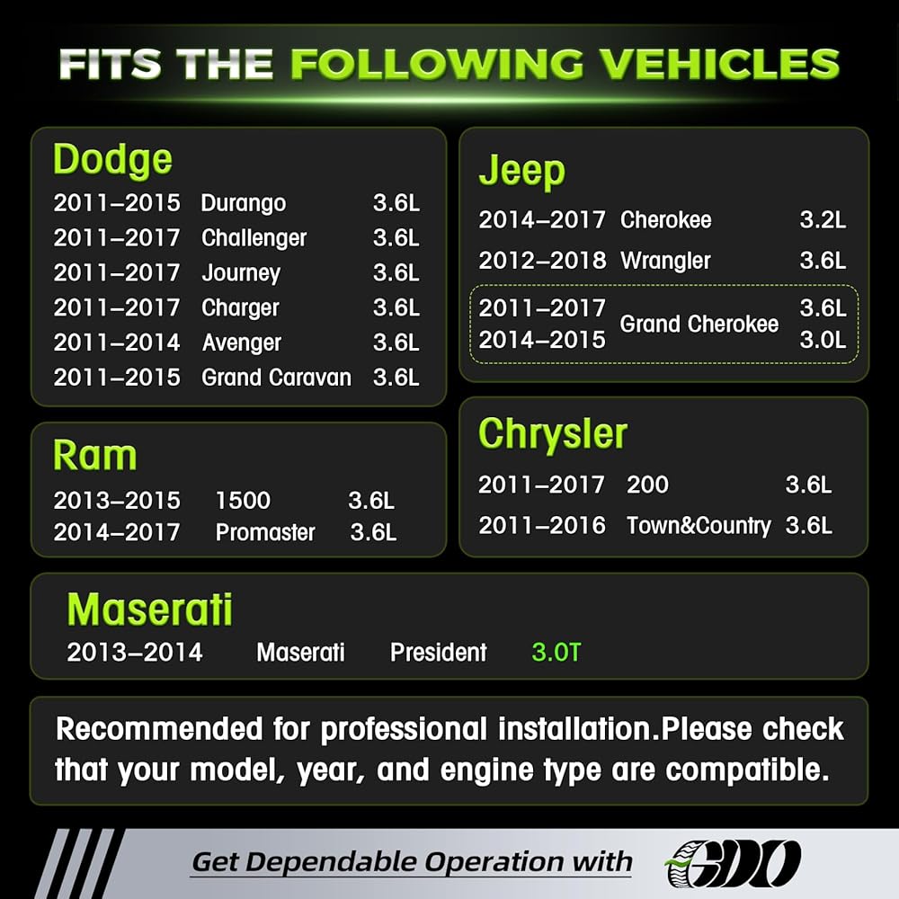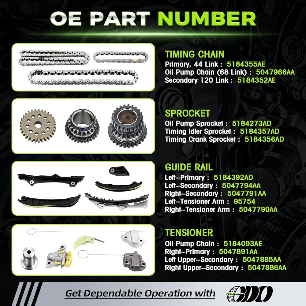 • 【FITMENT- Jeep & Maserati】:This 3.6 Timing Chain Kit fits for Chrysler, 2011-2017 Chrysler 200 3.6L, 2011-2016 Chrysler Town&Country 3.6L; Fits for Jeep, 2011-2017 Jeep Grand Cherokee 3.6L, 2014-2015 Jeep Grand Cherokee 3.0L, 2014-2017 Jeep Cherokee 3.6L, 2012-2018 Jeep Wrangler 3.6L; Fits for Maserati, 2013-2014 Maserati President 3.0T