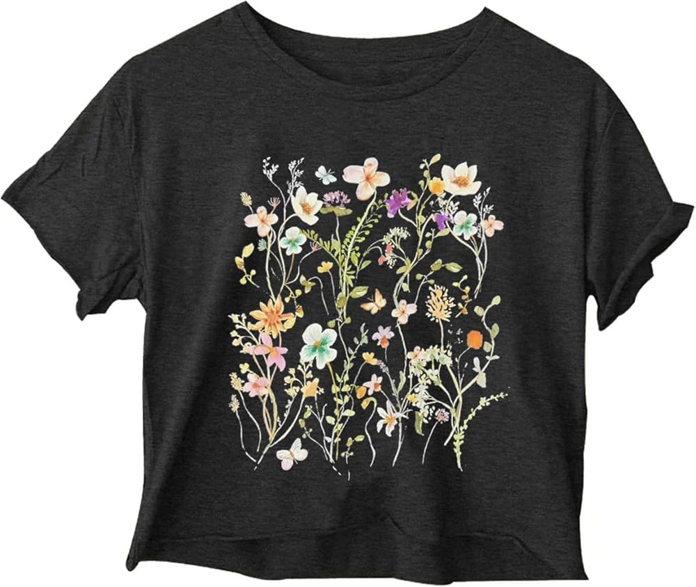 Woffccrd Womens Short Sleeve Crop Tops Wildflower T-Shirts Crew Neck Summer Casual Loose Graphic Tee Tops