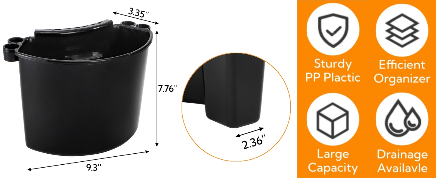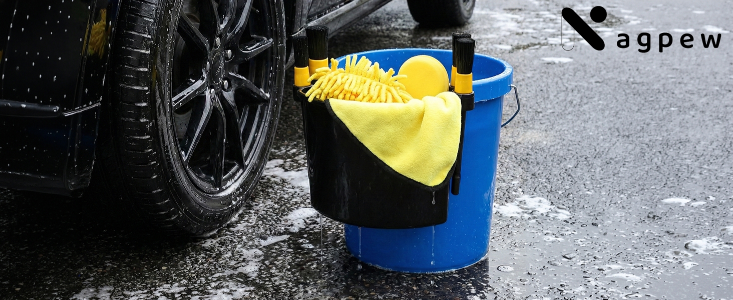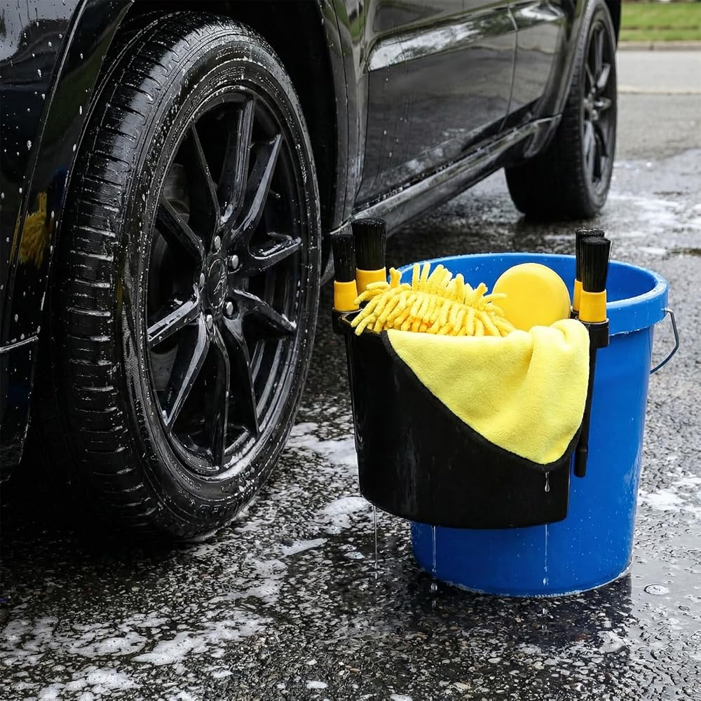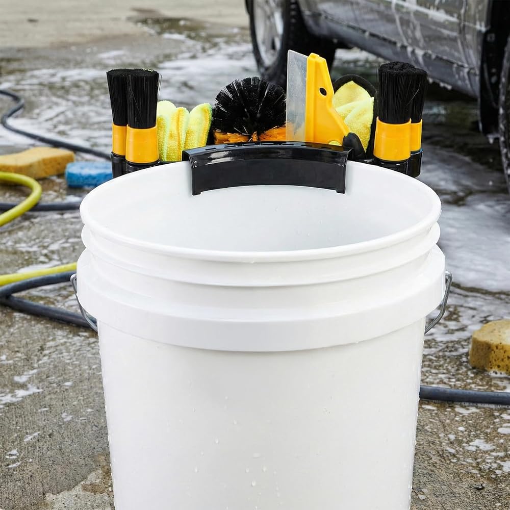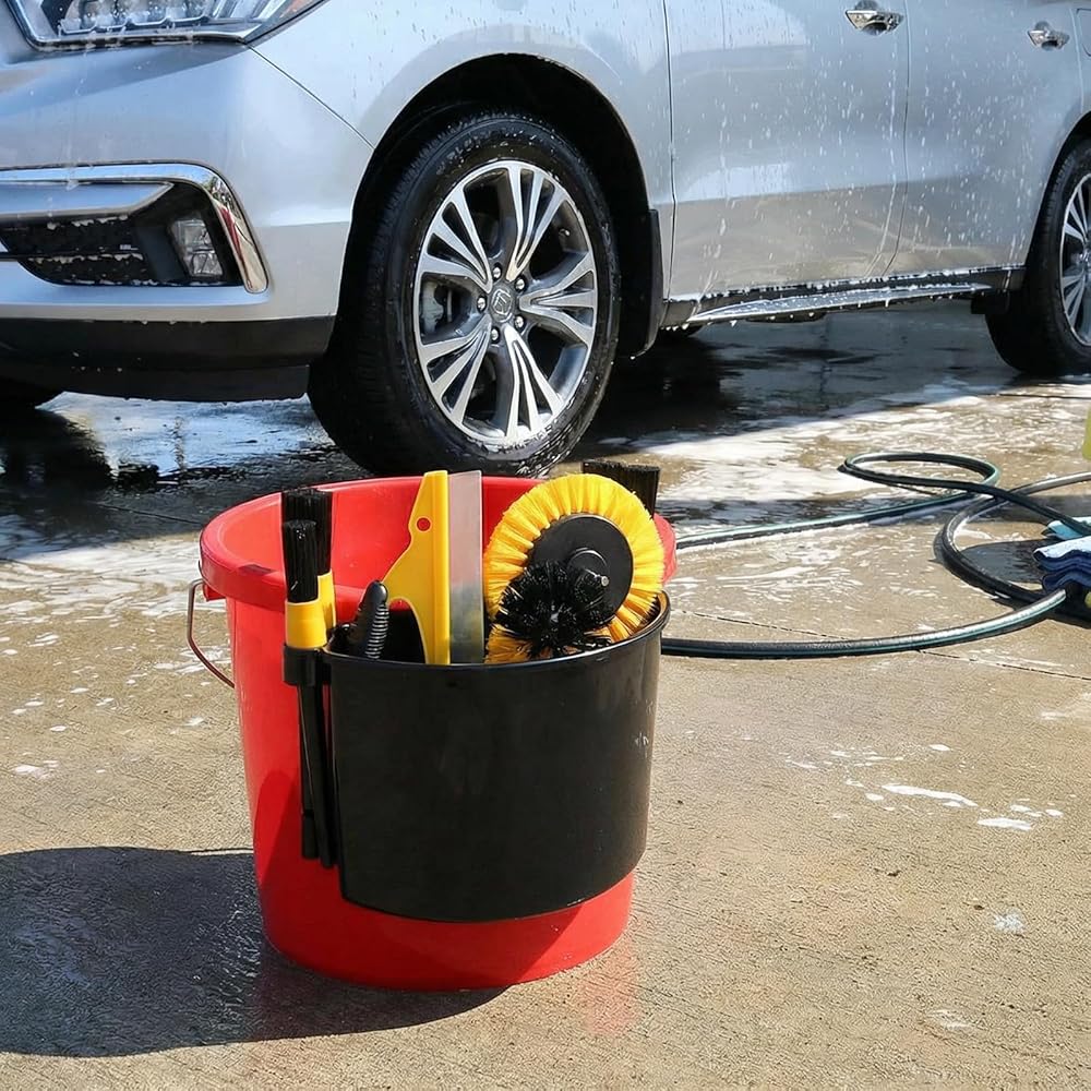 Offer Max Convenience: Hang on the bucket rim, keep all the tools within arm's reach. Four side rings are designed for inserting brushes. The wide-open interior holds multiple bottles, spray cans, or cleaning accessories without clutter