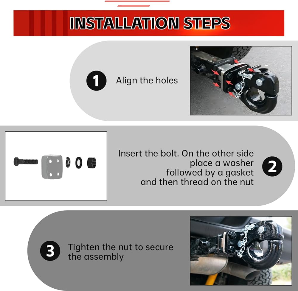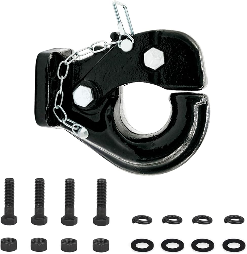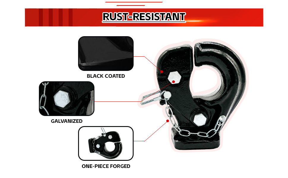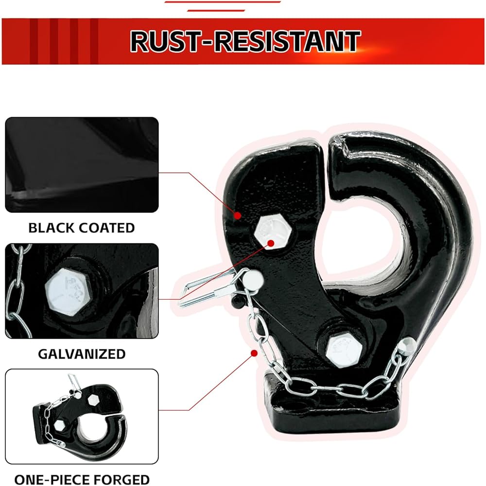 [ Flexible Hook Design ]:The adjustable hook effortlessly accommodates trailers of various sizes and can be securely fastened to 2-1/2 to 3 inch pintle rings, providing enhanced versatility for diverse towing applications.
