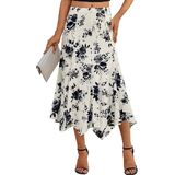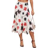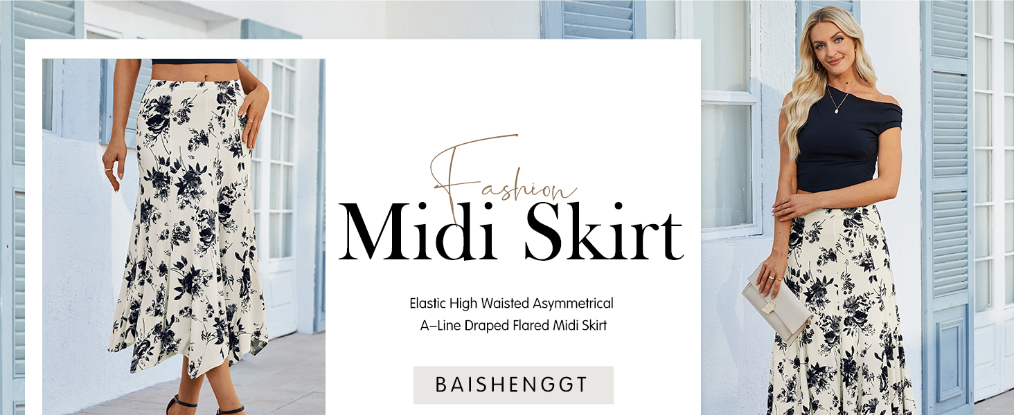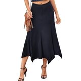 Elastic high waistband, 8-panel cut with right-swept hemline, asymmetrical high low hanky hem, below knee length, versatile midi skirt easy to dressy and casual